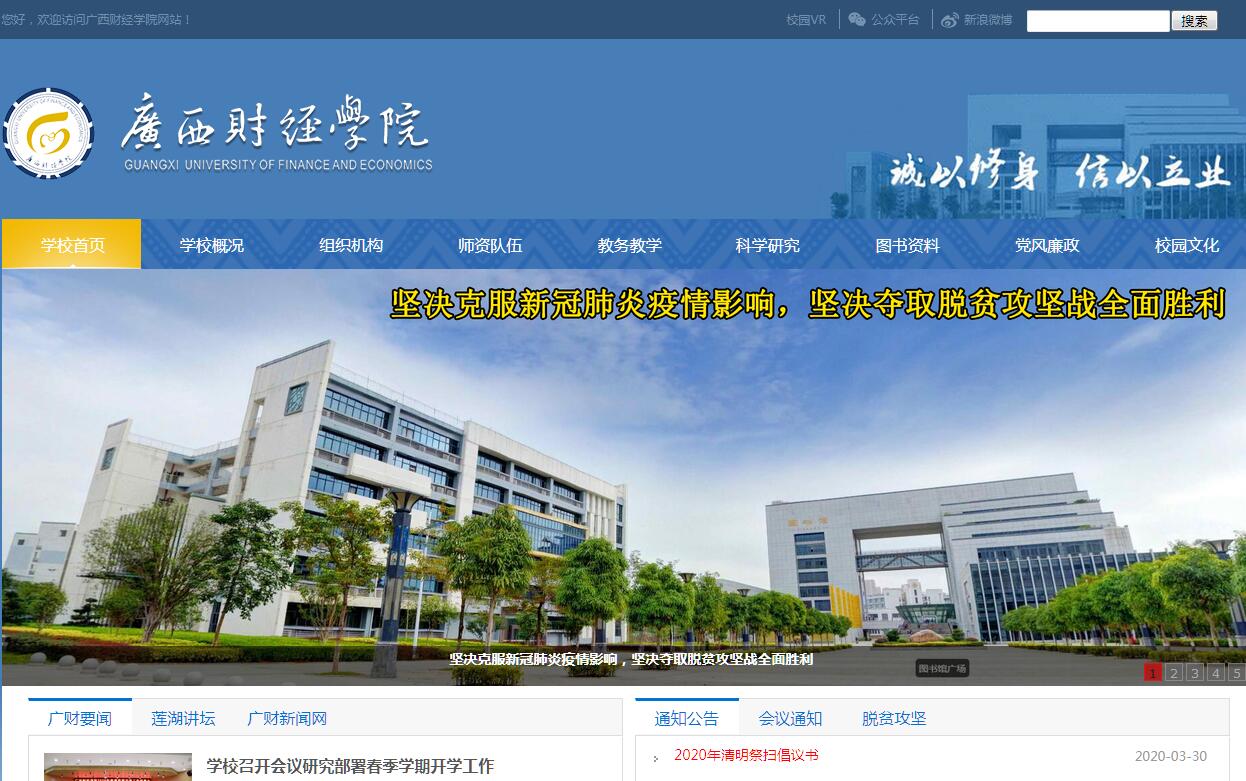 广西财经学院成立于2004年,由原广西财政高等专科学校和广西商业高等专科学校合并组建而成,是广西唯一独立设置的财经类普通本科高校,是广西壮族自治区人民政府重点建设高校。学校于2010年通过本科教学工作合格评估,2011年成为“服务国家特殊需求”会计专业硕士培养单位,2012年成为外交部和教育部授牌的“中国—东盟金融与财税人才培训中心”,2013年成为广西特色高校立项建设单位,2014年获广西高校首批“2011协同创新中心”认定,2016年获教育部应用型本科高校建设立项、“经济与管理实验教学中心”获批国家级实验教学示范中心,2017年成为教育部全国首批深化创新创业教育改革示范高校。现设置13个学院、1个教学部,开设51个本科专业,拥有1个硕士专业学位授权点。全日制在校本科生、研究生、专科生、留学生26635人,其中本科生20046人,本科生占全日制在校生总数75.26%。现有专任教师1099人,国家“万人计划”哲学社会科学领军人才1人,全国文化名家暨“四个一批”人才1人,“新世纪百千万人才工程”国家级人选1人,教育部“新世纪优秀人才支持计划”人选1人,享受国务院政府特殊津贴专家3人,二级教授6人,自治区级教学团队3个,自治区级教学名师2人。建有各类“本科教学工程”国家级项目8个、省级项目49个。其中,国家级人才培养模式创新实验区1个、国家级特色专业2个、国家级专业综合改革试点项目1个、国家级实验教学示范中心1个、国家级大学生校外实践教育基地建设项目1个、国家级视频公开课1门、国家级双语教学示范课程1门;省级人才培养创新实验区2个、省级紧缺人才专业建设项目1个、省级优势特色专业(群)25个、省级虚拟仿真实验中心1个、省级实验教学示范中心4个、省级精品视频公开课3门、省级精品课程13门。获国家级教改项目3项,省级教学改革立项201项;获国家级教学成果二等奖1项,省级教学成果一等奖11项、二等奖11项、三等奖12项,省级创新创业教学成果奖3项;在中国“互联网+”大学生创新创业大赛和“挑战杯”全国大学生课外学术科技作品竞赛和中国大学生创业计划竞赛等全国大学生各类竞赛活动中获奖150余项。构建了以经济学、管理学学科为主,经、管、文、法、理、工、艺多学科协调发展的学科体系,经济学、会计学、财政学、金融学等11个二级学科被认定为广西高校重点学科或特色优势学科;是广西立项建设的硕士学位授予单位。有省级重点实验室(培育)1个,广西高校重点实验室1个、人文研究基地4个,自治区级智库4个;近年来,承担各级各类科研课题1200多项,其中国家级76项(国家社会科学基金重大项目1项、重点项目3项)、省部级327项;获省部级以上科研成果奖36项。与国外及港澳台的50余所高校和教育机构建有校际合作关系,特别是与东盟国家高校交往频繁。现有中外合作办学项目2个、中外校际交流项目5个,设有ACCA全球考试考点1个。校园占地4276亩(其中武鸣校区在建),校舍建筑面积41.94万平方米,固定资产总值10.29亿元,教学科研仪器设备总值2.8亿元。图书馆建筑面积4.6万平方米,藏书及电子图书329万册,中外文数据库46个。学校注重内涵式发展,立足广西、面向基层、服务社会、辐射东盟,大力调整优化学科、专业结构,提升学校办学核心竞争力,努力建设特色鲜明的高水平财经大学。