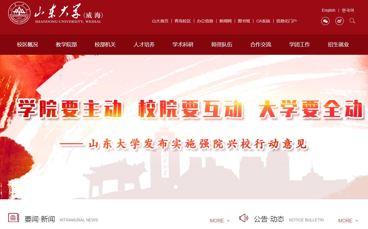 山东大学是一所历史悠久、学科齐全、学术实力雄厚、办学特色鲜明,在国内外具有重要影响的教育部直属重点综合性大学,是世界一流大学建设高校(A类)。山东大学(威海)创建于1984年,是山东大学与威海市政府联合共建的多学科、开放式、综合性大学校区。她的诞生,开创了我国名校异地办学的先河;她的成长,印证了改革开放以来我国高等教育不断深化改革与科学发展的光辉历程。学校建筑面积近50万平方米,现有11个学院和1个教学部,46个本科专业,涵盖文学、艺术学、法学、经济学、管理学、理学、工学和医学等八大学科门类,可在25个一级学科招收硕士研究生、17个一级学科招收博士研究生,同时可在18个一级学科招收博士后,已形成了培养博士生、硕士生、本科生、国际学生等多层次的教育体系。现有全日制统招本科生14900余人,国际学生1000余人,博硕士研究生1400余人;教职工1240余人,其中教授、副教授379人,博士、硕士生导师422人。学校基础教学设施完备。图书馆拥有中外文藏书157万册,电子图书250万册,各类中外文电子文献数据库200余个,是集文献服务、知识服务、个性化服务于一体的多类型、多层次、全开放式管理的现代化图书馆。教学、科研实验室68个,语音室24个,多媒体教室197个,并建有先进的智慧教师、云教室和同声传译实验室等,教学、科研仪器设备2万余台(套),多媒体教室和语音室座位数1.9万多个。在山东大学一体发展框架下,威海校区坚持“一项计划、两大战略、三型校区”的发展规划,即深入实施“学术提升计划”,贯彻落实“特色立校战略和人才强校战略”,努力建设“异地办学的示范性校区、坚持特色发展的高水平校区、加强国际合作的开放式校区”,不断提升校区学术竞争力、社会影响力和国际化水平,加快建设成为山东大学创建世界一流大学的新亮点。学校坚持深化教育教学改革,人才培养质量稳步提高。已有国家级和省级精品课程18门,朝鲜语专业为国家级特色专业,另有省级品牌专业及特色专业12个,省级优秀教学团队4个,国家、省级优秀教材14部;国家级教师教学发展示范中心分中心1个,省级实验教学示范中心3个,省级双语教学示范课程3门,省级教学研究与教学改革项目30项;鼓励学生积极开展科技创新活动,已获国家大学生科技创新项目167项,参加中国“互联网+”大学生创新创业大赛、大学生数学建模竞赛、电子设计竞赛、智能汽车竞赛、节能减排社会实践与科技竞赛、机电产品创新设计竞赛、“挑战杯”等课外学术科技竞赛,近三年获得国家奖90多项,省级奖1000余项。学校不断优化科研环境,提升科研实力。近几年先后承担国家社科基金重大项目、国家重点研发计划、国家社科基金项目、国家自然科学基金项目、教育部重点基地重大项目、教育部人文社科研究项目、军工科研项目、中国博士后科学基金、山东省科技发展计划项目、山东省社科基金项目、山东省自然科学基金、山东省海洋经济创新发展区域示范项目等各类省部级及以上科研项目360余项,企事业单位委托项目近500项,获地厅级及以上科研成果奖80余项。科研平台建设成效显著,拥有教育部深空探测联合研究中心“行星光谱与空间天气分中心”“山东省光学天文与日地空间环境实验室”“山东省海洋微生物菌种资源库平台”“山东省海洋生物繁育工程技术研究中心”“山东省生态型人工鱼礁实验中心”“法律方法与立法学研究中心”等9个省部级科研平台和重点研究基地;加强与国外大学和科研机构协同创新平台的合作建设,在空间科学、机械电子、新型材料、海洋牧场以及东北亚区域性研究、旅游管理等方向深度参与国际科研合作。与澳大利亚斯威本科技大学、威海市临港区等多家单位联合共建的“先进制造业联合研究中心”落户威海市临港区;与美国圣路易斯华盛顿大学合作共建的“行星数据系统实验室(PDS)”频频产出高质量的研究成果。山东大学威海天文台年均科普1万余人次,2014年获评全国优秀科普教育基地。学校深入实施“三跨四经历”教育。“三跨”即跨学科、跨学校、跨国境学习,“四种经历”即本校学习经历、海外学习经历、第二校园经历和社会实践经历。近年来,学校与澳、美、英、法、德、韩、日、西、俄、瑞、加、新西兰等13个国家和地区的108所高校建立了合作关系,共同搭建国际合作平台,鼓励优秀学生赴澳大利亚国立大学、美国加州大学伯克利分校等一批世界顶尖名校参加双学位项目和本硕连读项目。学校还分别与澳大利亚国立大学、西澳大学、皇家墨尔本理工大学合作开办了中外合作办学项目,开展联合培养工作。同时,在校生还可通过校际交流,到国内著名高校体验第二校园文化。学校设有多种奖学金,对品学兼优的学生给予奖励,拥有完善的国家助学贷款、困难补助和勤工助学制度,帮助家庭经济困难的学生完成学业。学生在圆满完成学业后,由山东大学颁发统一的毕业证书。同时,有近12%的应届毕业生被免试推荐到“双一流”高校以及国家级科研院所等攻读研究生。作为山东大学体系的重要组成部分,学校始终秉承“为天下储人才、为国家图富强”的办学宗旨,坚持特色引领、内涵发展,全面深化综合改革,不断提升办学质量,为山东大学创建世界一流大学而努力奋斗。