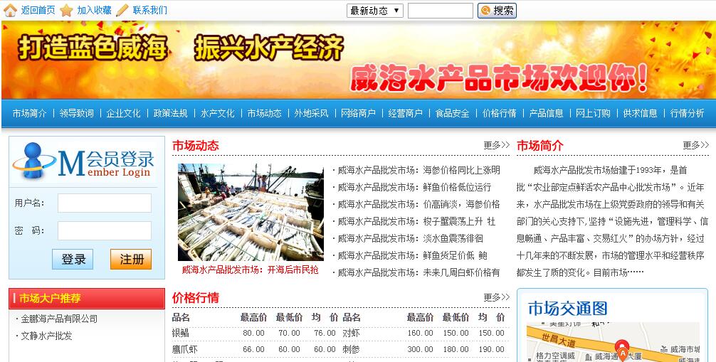 威海水产品批发市场始建于1993年,是首批“农业部定点鲜活农产品中心批发市场”。近年来,水产品批发市场在上级党委政府的领导和有关部门的关心支持下,坚持“设施先进,管理科学、信息畅通、产品丰富、交易红火”的办场方针,经过十几年来的不断发展,市场的管理水平和经营秩序都发生了质的变化。目前市场共引进经营业户400余家,就业人数达1200多人,经营的水产品150余种,给国家创造税费200余万元,给社会带来经济效益上千万元。产品辐射国内北京、天津、大连、江苏、温州等20多个省市和日本、韩国等国家,极大地丰富了市民的菜篮子,加快了水产品流通,振兴了威海经济。市场从1995-2005年连续十年被山东省工商局命名为“省级规范化文明市场”;连续多年被市消协评为消费者满意单位;被区综治委评为环翠区社会治安综合治理先进单位;连续多年被国家农业部渔业局评为先进计算机联网单位;被农业部信息中心评为计算机先进联网单位。十几年来,威海水产品批发市场不断改革、创新、完善管理机制,全面推行“一站式服务”和“首问负责制”的管理方式 ,吸引了全国各地大批的经营业户到市场来经营。我们每年都定期召开经营业户座谈会和经营业户代表大会,认真听取经营业户的意见和建议,让经营业户参与市场建设、改造和管理,经过我们和经营业户的共同努力,市场交易秩序良好,市场繁荣昌盛。目前,市场通过进一步完善经营设施,加强内部管理,完善市场服务功能、提高信息化建设,与广大业户共同努力,本着求实、创新、争一流的企业精神,以一流的环境与设备、一流的管理与服务,为创建国内一流市场而不懈努力。我们诚挚地欢迎广大经营者到市场安家落户,殷切地期待海内外合作伙伴前来共创伟业。