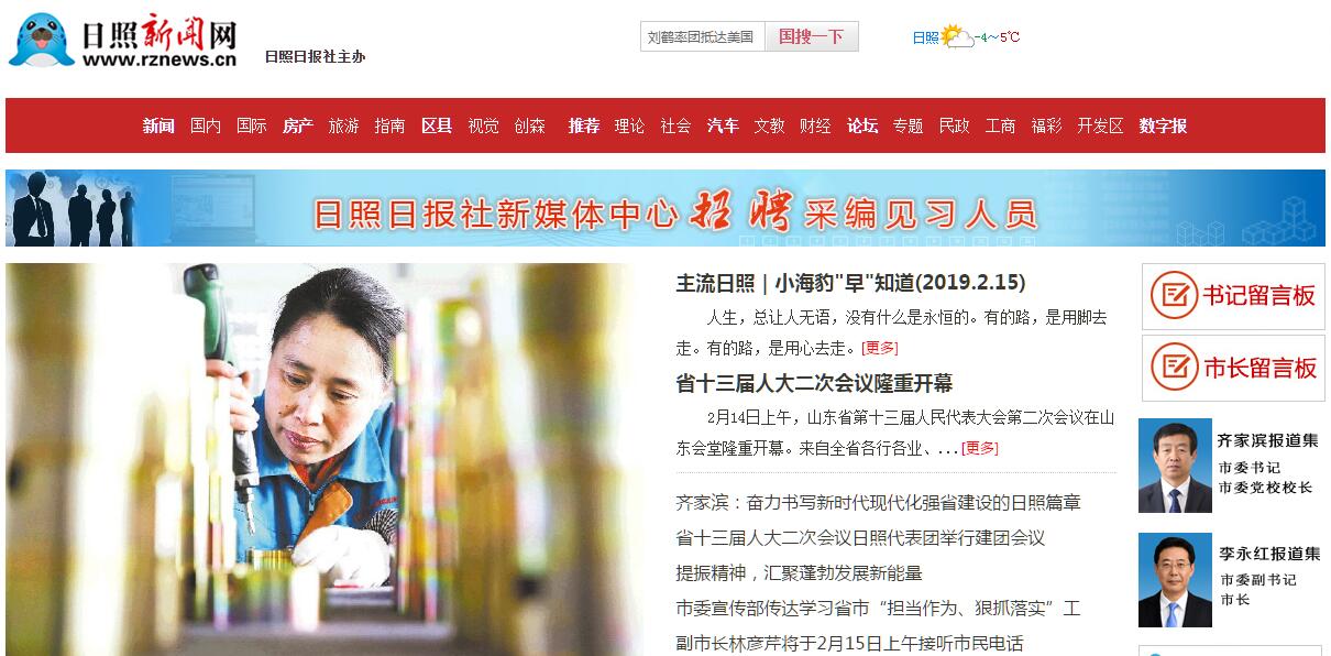 日照新闻网(http://www.rznews.cn/),日照第一门户网站。是由日照日报社主办、日照最具公信力最有影响力的主流综合门户网站,是中共日照市委、日照市人民政府重点打造的核心权威网站,也是山东省人民政府新闻办公室批准有采访、发布新闻权的日照市的两家网站之一。网站荣获2011全国地方优秀网络媒体、2013全国地方网络媒体最具人气品牌十强、2014全国地方网站最具影响力品牌奖、2016全国地方网络媒体十大最具影响力品牌奖等殊荣,“最日照”微信公众号荣获2016全国地方网络媒体优秀微信公众号奖。日照新闻网于2003年11月1日开通,2007年11月8日开通数字《日照日报》和《黄海晨刊》。数字报纸综合运用了文字、音频、视频、图片等多种传播手段,打造了全新的信息资源聚合平台和传播平台,这是山东省继烟台、威海、青岛后第五家市级数字报纸,也是继网络化办公后日照报业信息技术的又一次飞跃,使读者无论何时何地,都能够实现便捷快速的网上读报。数字报纸不仅保留了报纸版面语言的魅力,在版式上更尊重人们的阅读习惯。——主要频道:日照新闻、视觉日照(日照图库)、日照论坛等。日照新闻网“我爱日照论坛”是市里重点打造的日照市网络问政平台,有76个市直部门、单位上线。日照新闻网与中共日照市纪委、日照市监察局、日照市政府纠风办、日照市人民检察院及日照日报社联合推进此项工作。——影响广泛:日照新闻网已参与百度搜索及百度推广;加入中国网络联盟、中国地市新闻网盟及山东网盟、中原网盟、淮海网盟等,可与全国各大新闻门户网站合作策划开展宣传、运营活动,网络领域资源全面延伸。