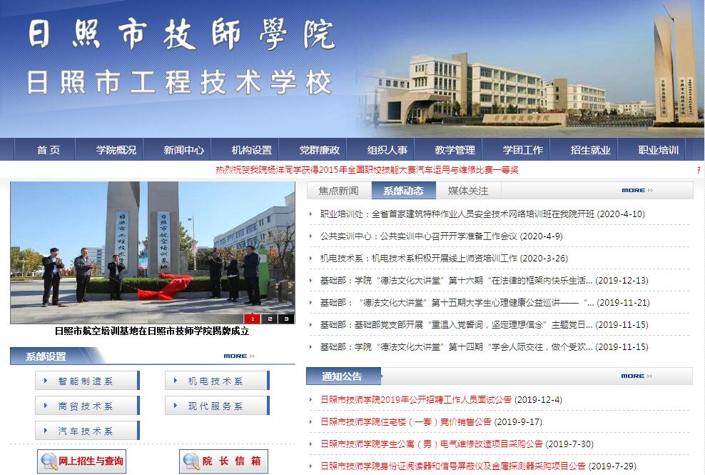 日照市技师学院前身为日照市技工学校,始建于1985年,2005年与日照市职工中等专业学校合并,2008年升格为高级技工学校,并迁至日照大学科技园新校区,2012年经山东省人民政府批准,改建为日照市技师学院。多年来,学院牢固树立“服务区域经济社会发展”宗旨,始终坚持就业为导向、育人为中心、能力为本位的办学指导思想,以培养高素质、实用型、高技能人才为目标,秉承“厚德尚能,精技乐业”的校训,与时俱进、创新创业,累计培养各类技能人才5万余人,为日照经济社会发展注入了强劲动力。学院占地553亩,总建筑面积17.1万平方米,现有教职员工321名,全日制在校生6000余名,年社会培训量5000人次以上;设立机械技术系、汽车技术系、电气技术系、商贸技术系、应用技术系、基础教学部6个教学系部,开设数控加工、汽车检修、电气自动化、会计电算化、建筑施工等10个专业大类、36个专业方向;建有数控、机械加工、机修、焊接、汽车检修等15处大型实训中心和数控仿真、机电维修、电子商务等80余处实验实训室,配有各种先进专业设备4000余台套,固定资产总值超过4亿元,形成了以预备技师、高、中级技工及普通中专教育为主体,全日制教育与职业培训多元并举的现代化职业院校。先后被确定为国家级重点技工院校、国家级高技能人才培训基地、山东省高技能人才培训基地、山东省技师培训基地、日照市示范性公共实训基地。