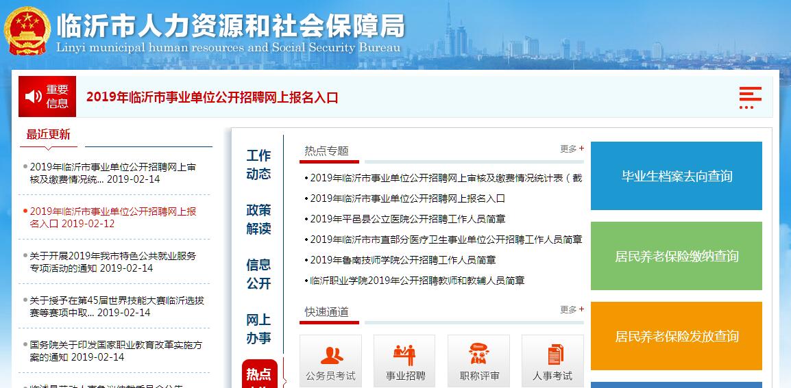根据省委、省政府批准的《临沂市人民政府职能转变和机构改革方案》(鲁厅字〔2014〕40 号)和《中共临沂市委临沂市人民政府关于临沂市人民政府职能转变和机构改革的实施意见》(临发〔2014〕23 号),设立临沂市人力资源和社会保障局,挂临沂市外国专家局牌子,为市政府工作部门。其主要职责:(一)贯彻执行人力资源社会保障法律、法规和方针、政策,负责起草人力资源和社会保障地方性法规、规章草案;拟订全市人力资源和社会保障事业发展规划和政策,并组织实施和监督检查。(二)拟订全市人力资源市场发展规划和人力资源流动政策,建立统一规范的人力资源市场,促进人力资源合理流动和有效配置;拟订人力资源服务业发展规划和政策;健全人力资源市场监管体系。(三)负责促进就业创业工作;拟订统筹城乡就业创业发展规划和政策,完善城乡劳动者平等就业制度、就业援助制度和职业培训制度,健全公共就业创业服务体系;牵头拟订高校毕业生就业创业政策;负责就业、失业预测预警和信息引导,拟订应对预案,实施预防、调节和控制,保持就业形势稳定。(四)统筹建立覆盖城乡的社会保障体系;拟订城乡社会保险及其补充保险政策、标准并组织实施;贯彻执行社会保险关系转续办法和基本养老保险省级统筹办法;拟订机关企事业单位基本养老保险政策并逐步提高基金统筹层次;会同有关部门拟订社会保险及其补充保险基金管理和监督制度;编报全市社会保险基金预决算建议草案;参与监督市社会保障基金管理运营情况;负责社会保险基金预测预警和信息引导,拟订应对预案,实施预防、调节和控制,保持社会保险基金总体收支平衡。(五)负责政府人才综合管理工作;拟订人才开发地方性法规、规章草案和政策;参与深化人才发展体制机制改革工作;组织拟订全市专业技术人才、高技能人才规划、政策以及留学回国人员来我市创新创业政策,并组织实施;健全落实博士后制度;协调推进全市人才服务体系建设;负责非教育系统公派留学工作;拟订专业技术人员管理和继续教育政策并组织实施;牵头深化职称制度改革工作;推进职业资格制度改革;负责高层次专业技术人才、高技能人才的选拔、管理服务工作;拟订全市技工院校及职业培训机构发展规划、政策并组织实施;负责配合有关部门指导本系统、本行业社会组织党建工作。(六)负责全市行政机关公务员综合管理;贯彻执行公务员管理的法律法规和相关政策,会同有关部门贯彻执行公务员分类、录用、登记、考核、奖惩、任用、培训、调任、辞职、辞退等方面的实施办法,拟订事业单位工作人员参照公务员法管理和聘任制公务员管理办法,并组织实施和监督检查;会同有关部门贯彻执行国家、省荣誉制度,拟订政府奖励制度并组织实施;办理市政府提请市人大常委会决定任免工作人员的手续和市政府任免工作人员的有关事项。(七)负责全市事业单位人事综合管理,指导事业单位人事制度改革,拟订事业单位人员和机关工勤人员管理政策;拟订有关人员调配政策,承办有关工作人员调配工作,负责援建地区、重点建设项目人员选调派遣及内调人员安置工作。(八)会同有关部门贯彻执行机关、事业单位人员工资收入分配政策,拟订企业人员收入分配调控政策,建立健全机关企事业单位人员工资正常增长和支付保障机制;贯彻执行机关企事业单位人员福利和离退休政策。(九)综合管理全市引进国外智力和赴国(境)外培训工作;贯彻执行引进国外智力规划和政策,编报引进国外智力专项经费预算,并监督实施;负责全市出国(境)培训项目及人员的审批、审核、备案和来我市工作的外国专家的管理工作;组织实施重点出国(境)培训项目和聘请外国专家规划;拟订吸引国(境)外专家来我市工作政策并组织实施;贯彻执行国(境)外专家来我市定居政策;指导全市人力资源和社会保障方面的对外交流工作。(十)会同有关部门拟订军队转业干部安置政策和安置计划;负责军队转业干部培训工作;指导自主择业军队转业干部管理服务工作。(十一)会同有关部门拟订农民工工作规划和政策,并组织实施;协调解决重点难点问题,维护农民工合法权益。(十二)贯彻执行劳动人事争议调解仲裁制度和劳动关系政策,完善劳动关系协调机制;贯彻执行消除非法使用童工政策和女工、未成年工的特殊劳动保护政策;组织实施劳动监察,协调劳动者维权工作,依法查处违法案件。(十三)依法依规履行本行业领域安全生产监管职责。(十四)承办市委、市政府交办的其他事项。