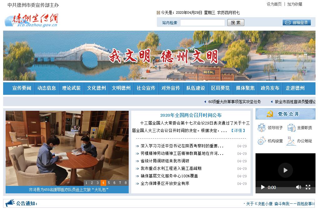 德州宣传网由中共德州市委宣传部主办。德州市委宣传部是市委主管意识形态方面工作的综合职能部门,其主要职责有:(一)贯彻落实党中央和省、市委关于宣传思想文化事业发展的指导方针。(二)制定全市宣传思想文化工作的任务和措施;指导市直宣传文化系统各单位和各县市区党委宣传部的工作。(三)负责组织指导全市理论教育、研究和宣传工作;规划、部署、督查全市各级干部的理论学习;对市社科联的工作实施政治方向和方针政策的指导。(四)负责引导社会舆论,指导、协调新闻、出版等部门的工作;在方针政策和宣传业务上指导德州日报社、德州广播电视台。(五)从宏观上指导全市精神产品的管理工作;负责在方针政策和宣传文化业务上指导市文广新局的工作,对市文联的工作实施政治方向和方针政策的指导。(六)规划、部署全局性的思想政治工作和群众性社会主义精神文明建设活动;与有关部门共同做好党员教育工作,负责编写选定党员教育教材;与有关部门研究和改进群众思想教育工作;领导市委精神文明建设委员会办公室和市职工思想政治工作研究会。(七)协同市委组织部管理市直宣传文化系统的领导干部,指导这些部门领导班子的建设,对科级干部的任免进行审查把关;对各县市区党委宣传部部长的任免提出意见;制订宣传干部培训规划,并组织实施。(八)负责全市企业政工人员职称的评审、管理工作;协同有关部门负责全市新闻出版系列中级职称的评审和高级职称的推荐工作。