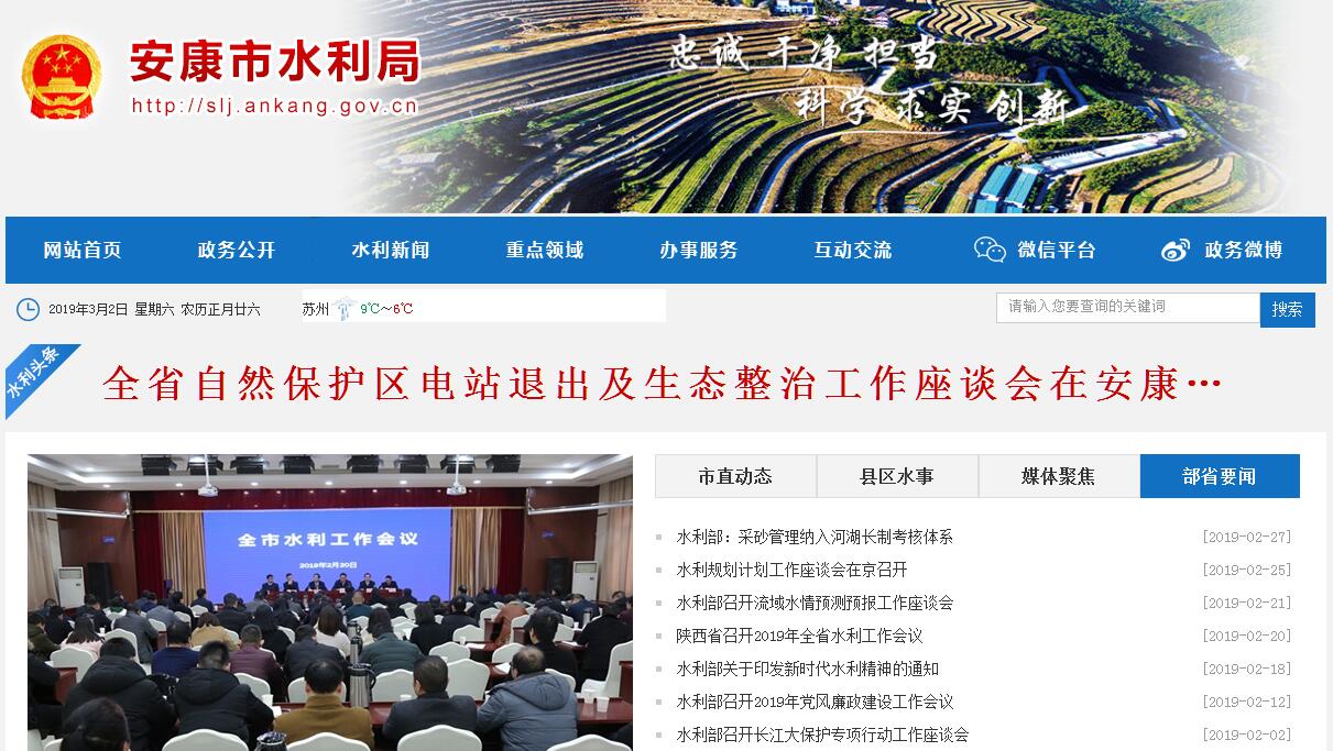 安康市水利局主要职责:(一)贯彻执行国家涉水等法律法规和方针政策,拟订有关规范性文件并组织实施。负责保障水资源的合理开发利用,拟订全市水利战略规划,组织拟订全市重要江河湖泊的流域综合规划、防洪规划等重大水利规划。按规划制定水利工程建设有关制度并组织实施,负责提出全市水利固定资产投资规模和方向、省市财政性水利资金安排的意见,按规定权限审批、核准规划内和年度计划规模内固定资产投资项目;提出中省水利年度建议计划并组织实施。(二)负责生活、生产经营和生态环境用水的统筹兼顾和保障。实施水资源的统一监督管理,拟订全市和跨县、区中长期供水规划、水量分配方案并监督实施,组织开展水资源调查评价工作;按规定开展水能资源调查工作,负责重要流域、区域以及重大调水工程的水资源调度,组织实施取水许可、水资源有偿使用制度和水资源论证、防洪论证制度;指导全市供水管理工作。(三)负责水资源保护工作。组织编制水资源保护规划,组织拟订重要江河湖泊的水功能区划并监督实施,核定水域纳污能力,提出限制排污总量建议,指导饮用水水源保护工作,指导地下水开发利用和城市规划区地下水资源管理保护工作,发布全市水资源公报。(四)负责防治水旱灾害工作,组织、协调、监督、指导全市防汛抗旱工作;拟订全市防汛抗旱工作规划、计划,编制、审查全市防汛抗旱和抢险应急预案及大中型水库汛期运用调度计划;指导全市河道日常管理工作;指导全市防汛抗旱物资的储备与管理,承担全市防汛抗旱信息系统建设管理工作;指导全市防汛抗旱减灾工作,组织协调抗旱服务工作;指导水利突发公共事件的应急管理工作。(五)负责节约用水工作。编制节约用水规划、计划,负责制订有关标准,指导和推动节水型社会建设工作。(六)指导全市水利行业的供水、水电及综合经营工作;研究提出有关水利的价格、信贷、财务等经济调节建议。(七)指导水利设施、水域及其岸线的管理与保护,指导全市重要江河、湖泊、水库、滩涂的治理和开发;指导水利工程建设与运行管理,组织实施具有控制性和跨县、区重要水利工程的建设与运行管理。(八)负责防治水土流失。拟定水土保持有关政策,编制水土保持规划并监督实施;负责全市水土保持法律法规及政策的宣传、贯彻和实施;负责全市水土流失综合治理、预防监督和监测预报工作;按规定负责重大生产建设项目水土保持方案的审批、监督实施及水土保持设施的验收工作;指导水土保持重点建设项目的实施。(九)负责农村水利工作。组织协调全市农田水利基本建设,指导农村饮水安全,节水灌溉等工程建设与管理,指导农村水利社会化服务体系建设。按规定指导农村水能资源开发工作,指导水电农村电气化和小水电代燃料工作。(十)负责重大涉水违法事件的查处,协调、仲裁跨县区、跨部门水事纠纷,指导全市水政监察和水行政执法,负责水利行业安全生产工作,组织、指导水库、水电站大坝的安全监管,指导水利建设市场的监督管理,组织实施水利工程建设的监督。(十一)负责全市渔业管理工作。组织编制全市渔业发展战略、规划、计划并指导实施;负责水产品质量监督工作,主管全市水生野生动植物保护工作;指导全市渔政执法和队伍建设。(十二)负责水利科技与教育工作。组织开展水利行业质量监督工作,监督水利行业的技术标准、规程规范的实施,组织水利科研技术成果的推广和对外经济合作与交流,指导全市水利职工队伍建设。(十三)承办市政府交办的其他事项。