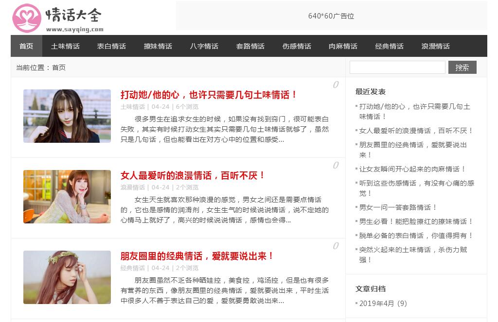 | 网站简介: 情话大全网(sayqing.com)分享土味情话,表白情话,撩妹情话,八字情话,肉麻情话,伤感情话,英文情话,经典情话,浪漫情话,套路情话等各类情话,情话宝典帮助你的爱情更上一层楼! |