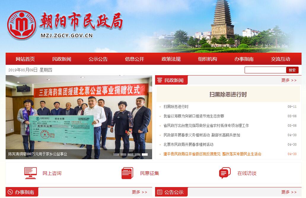 朝阳市民政局是朝阳市人民政府负责全市民政工作的职能部门。其主要职责是:(一)贯彻执行国家、省关于民政工作的方针、政策和法律法规,研究拟订全市民政事业发展规划和相关政策,并组织实施和监督检查。(二)承担依法对全市社会团体、基金会、社会服务机构进行登记管理和监督检查责任,负责无业务主管单位的全市性社会组织的党建工作。(三)组织和指导全市拥军优属工作,负责各类优抚对象的优待、抚恤、补助和国家机关工作人员伤亡抚恤工作,负责烈士褒扬工作,承担市双拥工作领导小组的日常工作。(四)负责全市军队退役士兵(含士官)、复员干部、军队离退休干部和无军籍退休退职职工接收安置工作,指导全市军队退役士兵职业技能培训和就业工作,指导全市军队离退休干部服务机构和军供站管理工作。(五)贯彻落实国家、省减灾救灾工作政策,负责组织、协调减灾救灾以及灾情核查工作,负责自然灾害救助应急体系建设,分配中央、省和市下达的救灾款物并监督其使用,组织、指导灾民安置和救灾捐赠,承担市减灾委员会的日常工作。(六)牵头拟订全市社会救助规划、政策,健全和完善城乡社会救助体系,负责城乡居民最低生活保障、医疗救助、临时救助工作,负责指导全市农村特困人员供养机构建设和管理,负责指导全市居民家庭经济状况核对工作。(七)拟订全市城乡基层群众自治建设和社区建设政策并指导实施,负责指导基层政权建设和社区服务体系建设工作。(八)负责全市行政区划管理,负责乡(镇)以上行政区域的设立、撤销、调整、更名和界线变更以及政府驻地迁移的审核报批工作,负责市级行政区域界线的勘定和管理工作,组织、指导县以下行政区域界线的勘定和管理工作,负责全市重要自然地理实体命名、更名的审核报批工作,规范全市地名标志的设置和管理,负责市内标准地名图书资料的审定工作。(九)拟订全市社会福利事业发展规划、政策并组织实施,组织、指导福利机构管理,推进慈善事业发展,组织、指导社会捐助工作,指导老年人、特困人员、孤儿、农村留守儿童、困境儿童等特殊群体权益保障工作。(十)负责推进婚俗和殡葬改革,指导全市公墓建设和管理工作,负责生活无着流浪乞讨人员救助工作,指导婚姻、殡葬、收养、流浪乞讨人员救助服务机构管理工作,指导全市涉外婚姻登记工作,推进全市社会工作人才队伍建设和相关志愿者队伍建设。(十一)承担市老龄工作委员会的日常工作,拟订全市老龄工作发展规划并组织实施;维护老年人的合法权益。(十二)承办市政府交办的其他事项。