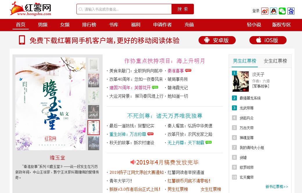 | 网站简介: 红薯网创建于2009年12月,是集创作、阅读、作品加工、IP运营为一体的中文小说阅读综合平台。目前红薯网全球alexa排名一万名左右,中文网站排名一千内。PC端、WAP站、APP每日流量超过50万人次,PV超过1000万。除了自有网站外,红薯网还积极拓展第三方渠道,目前与包括掌阅、移动、百度等近30家平台进行合作,月均全渠道销售额超过800万。红薯网目前已经成为众多作者创作的首选,每月有超过2000本作品在红薯连载。 |