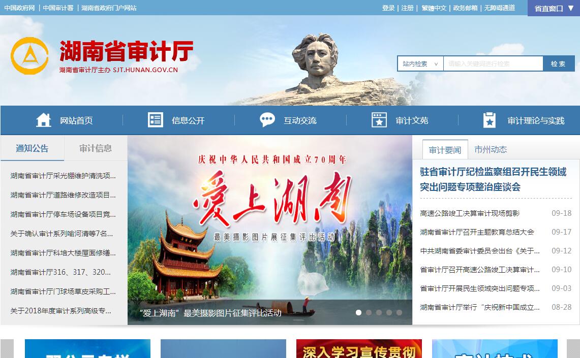 湖南省审计厅主要职责:(一)主管全省审计工作。负责对全省财政收支和法律法规规定属于审计监督范围的财务收支的真实、合法和效益进行审计监督,维护全省财政经济秩序,提高财政资金使用效益,促进廉政建设,保障全省经济和社会健康发展。对审计、专项审计调查和核查社会审计机构相关审计报告的结果承担责任,并负有督促被审计单位整改的责任。(二)贯彻执行国家关于审计工作的方针、政策和法律法规,研究拟订我省审计工作方针、政策,参与起草审计、财政经济及有关地方性法规、规章草案,制定审计业务规章制度,并监督执行。制定并组织实施全省审计工作发展规划和专业领域审计工作规划以及年度审计计划。对直接审计、调查和核查的事项依法进行审计评价,做出审计决定或提出审计建议。(三)向省人民政府报告和向省人民政府有关部门通报审计情况,提出制定和完善有关政策法规、宏观调控措施以及管理体制、机制建设的建议。(四)向省人民政府提出年度省本级预算执行和其他财政收支情况的审计结果报告。受省人民政府委托向省人大常委会提出省本级预算执行情况和其他财政收支情况的审计工作报告、审计发现问题的纠正和处理结果报告。依法向社会公布审计结果。(五)直接审计下列事项,出具审计报告,在法定职权范围内做出审计决定或向有关主管机关提出处理处罚的建议:1.省本级财政预算执行情况和其他财政收支。2.市州、省财政直管县人民政府预算执行情况、决算和其他财政收支。3.省直各部门、事业单位及其下属单位预算执行情况、决算和其他财政收支。4.省属国有企业和金融机构、省属资本占控股或主导地位的企业和金融机构的资产、负债和损益情况。5.省人民政府部门管理和和其他单位受省人民政府委托管理的社会保障基金、社会捐赠资金以及其他有关基金、资金的财务收支。6.省人民政府投资和以省人民政府投资为主的建设项目的预算执行情况和决算。7.省人民政府接收的国际组织和外国政府援助、贷款项目以及赠款项目的财务收支。8.法律、法规规定应由省审计厅审计的其他事项。(六)负责省领导干部经济责任审计领导小组办公室日常工作,按规定对省管党政领导干部及依法属于省审计厅审计监督对象的其他单位主要负责人实施经济责任审计,协调各成员单位运用经济责任审计成果。指导全省经济责任审计工作。(七)组织实施对国家财经法律、法规、规章、政策和宏观调控措施执行情况、财政预算管理或国有资产管理使用等与国家财政收支有关的特定事项进行专项审计调查。(八)负责审计署授权的审计项目和专项审计调查项目的组织实施。(九)依法检查审计决定执行情况,督促纠正和处理审计发现的问题,依法办理被审计单位对审计决定提请行政复议、行政诉讼或省人民政府裁决中的有关事项。协助配合有关部门查处相关重大案件。(十)指导和监督内部审计工作,核查社会审计机构对依法属于审计监督对象的单位出具的相关审计报告。(十一)与市州人民政府共同领导市州审计机关。依法领导和监督下级审计机关的业务,组织下级审计机关实施专项审计或审计调查,纠正或责成纠正下级审计机关违反国家规定做出的审计决定。按照干部管理权限协同办理市州审计机关负责人的任免事项。(十二)组织审计我省驻外非经营性机构的财务收支,依法通过适当方式组织审计省属企业和金融机构的境外资产、负债和损益。(十三)指导和推广信息技术在全省审计系统的应用,组织全省审计机关实施管理系统和现场审计系统的建设。组织审计专业培训。(十四)承办省人民政府交办的其他事项。