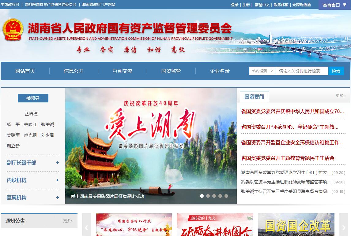 根据《中共湖南省委湖南省人民政府关于印发〈湖南省人民政府机构改革方案的实施意见〉的通知》(湘发〔2004〕2号)精神,设立湖南省人民政府国有资产监督管理委员会(以下简称省国资委),为省政府直属正厅级特设机构。省政府授权省国资委代表国家履行国有资产出资人职责。根据省委决定,省国资委成立党委,履行省委规定的职责。省国资委的监管范围是省属经营性国有资产及企业(不含金融类企业)。其主要职责是:(一)根据省政府授权,依照《中华人民共和国公司法》、《企业国有资产监督管理暂行条例》等法律、行政法规履行出资人职责,指导推进国有企业改革和重组;对所监管企业国有资产的保值增值进行监督,加强国有资产的管理工作;推进国有企业的现代企业制度建设,完善公司治理结构;推进国有经济结构和布局的战略性调整。(二)依照规定代表省政府向所出资的重要骨干企业派出监事会;负责监事会的日常管理工作。(三)依照法定程序对监管企业的企业负责人进行任免、考核,并根据考核结果对其进行奖惩;建立符合社会主义市场经济体制和现代企业制度要求的选人、用人机制,完善经营者激励和约束制度。(四)建立和完善国有资产保值指标体系,拟订考核标准;通过统计、稽核等方式对所监管国有资产的保值增值情况进行监管;维护国有资产出资人的权益。(五)拟订国有资产管理的地方性法规,制定有关规章制度;依法对市州国有资产管理进行指导监督。(六)根据省政府授权,负责对省直单位经营性国有资产进行监督管理。(七)履行出资人的其他职责和承办省政府交办的其他事项。