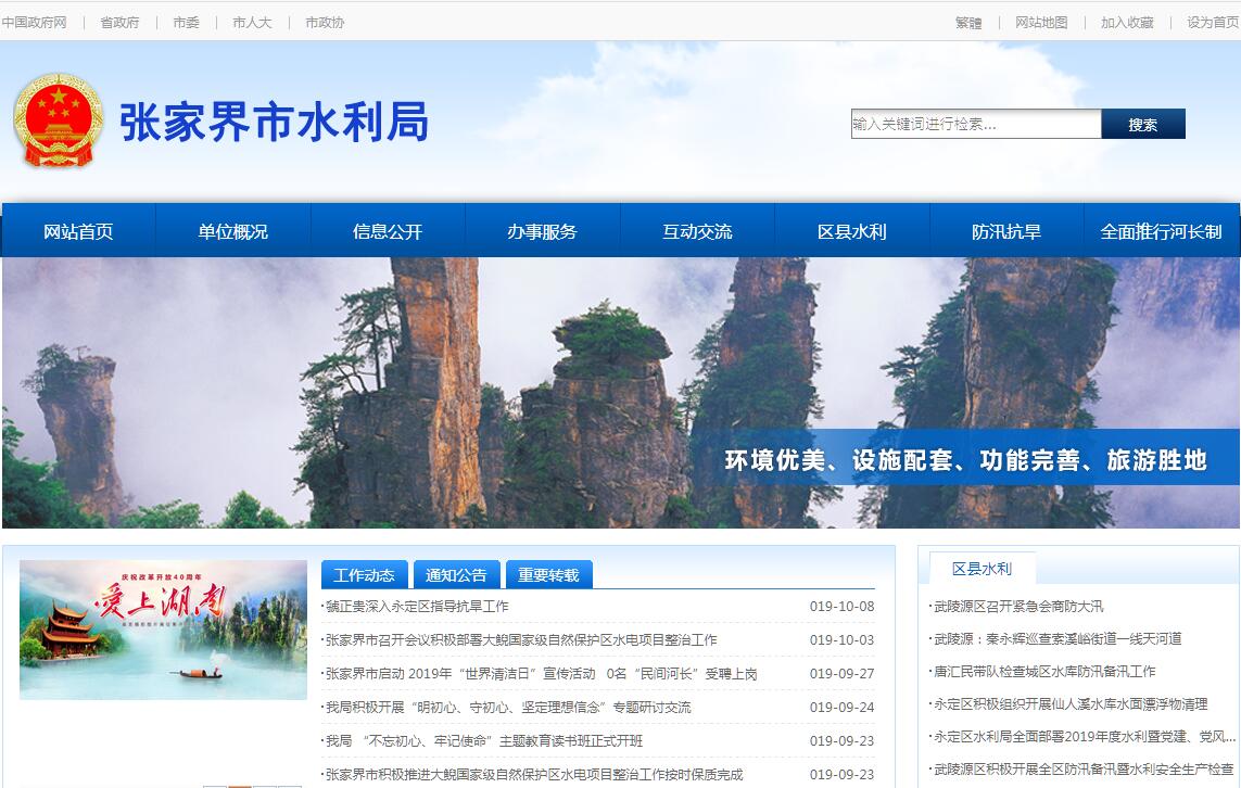 张家界市水利局主要职责:(一)负责保障全市水资源的合理开发和利用,拟订全市水利战略规划和政策,起草有关地方性法规、规章和规范性文件草案,组织编制市确定的重要河流、水库的流域综合规划、防洪规划等重大水利规划。按规定制定水利工程建设有关制度并组织实施,负责提出水利固定资产投资规模、方向和市财政性资金安排的建议,按规定权限审批、核准市规划内和年度计划规模内固定资产投资项目;提出省及市水利建设投资安排建议并组织实施。(二)负责生活、生产经营和生态环境用水的统筹兼顾和保障。实施水资源的统一监督管理,拟订全市和跨区县的水中长期供求规划、水量分配方案并监督实施,组织开展水资源调查评价工作,开展水能资源普查和调查评价;负责全市重要流域、区域的水资源调度,组织实施取水许可、水资源有偿使用制度和水资源论证、防洪论证制度,指导水利行业供水和乡镇供水工作。(三)负责水资源保护工作。组织编制水资源保护规划,组织拟订重要河流湖泊的水功能区划并监督实施,核定水域纳污能力,提出限制排污总量建议,负责入河排污口设置审批工作,指导饮用水水源保护工作,指导地下水开发利用和城市规划区地下水资源管理保护工作。(四)负责防治水旱灾害,承担市防汛抗旱指挥部的日常工作。组织、协调、监督、指挥全市防汛抗旱工作,对主要河流及重要水利工程实施防汛抗旱调度和应急水量调度,编制市防汛、抗旱应急预案并组织实施;指导水利突发事件的应急管理工作。(五)负责全市水能资源开发利用的统一监督管理,会同有关部门编制水能资源开发利用规划并监督实施,负责全市水能资源开发利用权有偿取得工作。(六)负责节约用水工作。拟订节约用水政策,编制全市节约用水规划,制定有关标准,指导和推动节水型社会建设工作。(七)指导水文工作。负责指导全市水文水资源监测、水文站建设和管理,对河流、水库和地下水的水量、水质实施监测,发布水文水资源信息、情报预报和全市水资源公报。(八)组织指导水利设施、水域及其岸线的管理和保护,组织指导河流、水库及河口、滩涂的治理和开发,负责河道管理工作,指导水利工程建设与运行管理,组织实施具有控制性的或跨区县的重要水利工程建设及运行管理。(九)负责防治水土流失工作。拟订水土保持规划并监督实施,组织实施水土流失的综合防治、监测预报并定期公告,负责中小型建设项目水土保持方案的审批、监督实施及水土保持设施的验收工作,指导水土保持建设项目的实施;负责水土保持规费征收制度的实施。(十)指导农村水利工作。组织协调农田水利基本建设,指导农村饮水安全、节水灌溉等工程建设与管理工作,指导农村水利社会化服务体系建设。(十一)指导农村水电电气化和小水电代燃料工作。(十二)指导全市水利行业的国有资产监管工作,负责对水利资金的使用和局属各单位国有资产的监管工作;指导水利经济和水利风景区建设与管理工作。(十三)负责涉水违法事件的查处,协调、仲裁跨区县水事纠纷,指导水政监察和水行政执法。依法负责水利行业安全生产工作,组织指导水库、水电站大坝的安全监管,指导水利建设市场的监督管理,组织实施水利工程建设的监督。(十四)开展水利科技工作,组织开展水利行业质量监督相关工作,指导和监督实施水利行业的技术标准、规程规范,承担水利统计工作,指导全市水利队伍建设,指导水利信息化工作。(十五)承办市人民政府交办的其他事项。