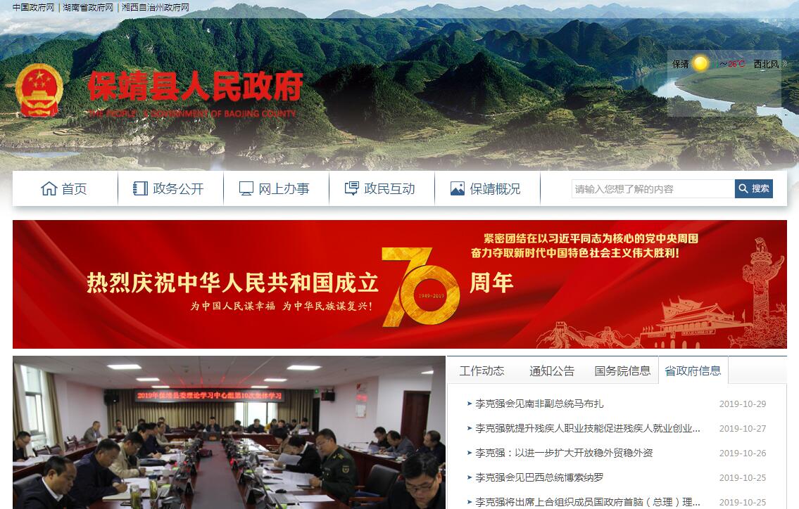 保靖县,隶属于湘西土家族苗族自治州,位于云贵高原东侧,武陵山脉中段,湖南省西北部,与吉首市、花垣县、永顺县、古丈县、龙山县、重庆市秀山县接壤;总人口31万人,世居主体民族有土家族和苗族72399人;辖迁陵、复兴、普戎、毛沟、野竹坪、清水坪、比耳、水田河、碗米坡、葫芦10个镇和大妥、阳朝、涂乍、水银、清水、夯沙6个乡,总面积1760.65平方公里。2015年,保靖县乡镇区划调整后,下辖2乡10镇。保靖是国家级贫困县,境内酉水河是湘西最神秘、最具特色、最具旅游开发前景的母亲河,仅县城迁陵至里耶河段就有汉代四方城遗址、摩天石刻“天开文运”、江口红石林、陡滩民族风情、碗米坡生态平湖游、首八峒八部大王庙、魏家寨西汉古城、里耶秦简等60余处景点。吕洞山、小寨沟、苗家边墙等其它景点也千姿百态、各有特色。2013年,保靖县生产总值35.97亿元,比上年下降14.1%。其中,第一产业增加值7亿元,增长2.2%;第二产业增加值15.15亿元,下降27.5%;第三产业增加值13.82亿元,与上年持平。按常住人口计算,人均生产总值12705元,下降14.4 %。保靖县三次产业结构为19.5∶42.1∶38.4。2018年9月25日,获得商务部“2018年电子商务进农村综合示范县”荣誉称号。