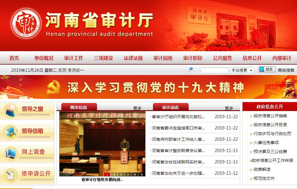 河南省审计厅主要职责:(一)主管全省审计工作。负责对全省财政收支和法律、法规规定属于审计监督范围的财务收支的真实、合法和效益进行审计监督,维护财政经济秩序,提高财政资金使用效益,促进廉政建设,保障国民经济和社会健康发展。对审计、专项审计调查和核查社会审计机构相关审计报告的结果承担责任,负有督促被审计单位整改的责任。(二)参与起草审计、财经方面的地方性法规、规章草案,制定审计制度并监督执行,制定并组织实施审计工作发展规划和专业领域审计工作规划,制定并组织实施年度审计计划。对直接审计、调查和核查的事项依法进行审计评价,作出审计决定或提出审计建议。(三)向省政府提交年度省级预算执行和其他财政收支的审计结果报告。受省政府委托向省人大常委会提交省级预算执行和其他财政收支情况的审计工作报告、审计发现问题的纠正和处理结果报告。向省政府报告其他事项专项审计调查情况及结果。依法向社会公布审计结果。向省政府有关部门和省辖市、省直管县(市)政府通报审计情况和审计结果。(四)直接审计下列事项,出具审计报告,在法定职权范围内作出审计决定或向有关主管机关提出处理处罚建议:1.省级预算执行情况和其他财政收支,省直各部门(含直属单位)预算执行情况、决算和其他财政收支。2.省辖市、省直管县(市)、省财政直管县(市)政府预算执行情况、决算和其他财政收支,省级财政转移支付资金。3.使用省级财政资金的事业单位和社会团体的财务收支。4.省级投资和以省级投资为主的建设项目的预算执行情况和决算。5.省属国有企业和金融机构、省政府规定的省属国有资本占控股或主导地位的企业和金融机构的资产、负债和损益。6.省政府部门和省辖市、省直管县(市)政府管理,其他单位受省政府及其部门委托管理的社会保障基金、社会捐赠资金及其他有关基金、资金的财务收支。7.国际组织和外国政府援助、贷款项目的财务收支。8.法律、行政法规和地方性法规规定应由省级审计机构审计的其他事项。(五)按规定对省管领导干部及依法属于审计监督对象的其他单位主要负责人实施经济责任审计。(六)负责对财经法律、法规、规章、政策和宏观调控措施执行情况,财政预算管理或国有资产管理使用等与省级财政收支有关的特定事项进行专项审计调查。(七)依法检查审计决定执行情况,督促纠正和处理审计发现的问题,依法办理被审计单位对审计决定提请行政复议、行政诉讼或省政府裁决的有关事项。协助有关部门查处相关重大案件。(八)指导和监督依法属于审计监督对象的单位的内部审计工作,核查社会审计机构对依法属于审计监督对象的单位出具的相关审计报告。(九)与省辖市、省直管县(市)政府共同领导省辖市、省直管县(市)审计机关。依法领导和监督市、县级审计机关的业务,组织市、县级审计机关实施特定项目的专项审计或审计调查,纠正或责成纠正市、县级审计机关违反国家规定作出的审计决定。按照干部管理权限协管省辖市、省直管县(市)审计机关负责人。(十)组织审计省政府驻外非经营性机构的财务收支,依法通过适当方式组织审计省属国有企业和金融机构的境外资产、负债和损益。(十一)在全省审计领域指导和推广信息技术应用,参与建设国家审计信息系统。(十二)承办省政府交办的其他事项。