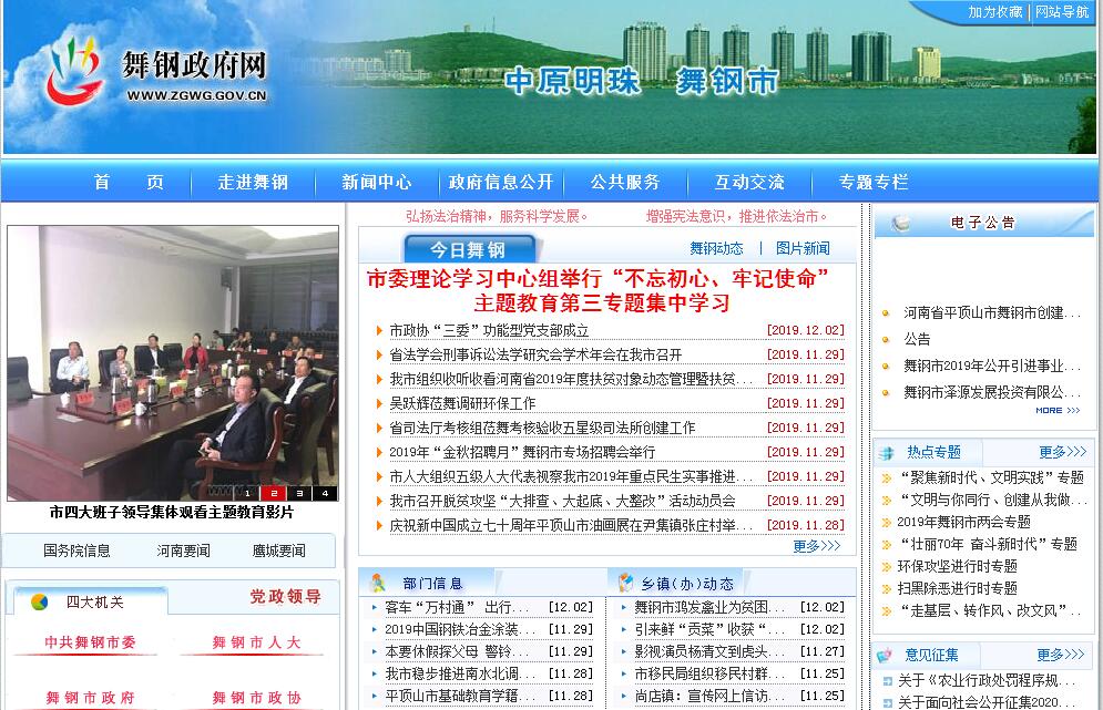 河南省舞钢市,是一座年轻的现代化工业生态旅游城市。位于河南中部,地处伏牛山东部余脉与黄淮平原交接地带。面积645.67平方公里,人口32万。辖朱兰、垭口、寺坡、院岭、矿建、铁山、红山7个街道办事处和武功、庙街、杨庄3乡及枣林、尚店、八台、尹集4镇。市人民政府驻地垭口。全市有回族、满族、苗族、白族、壮族、彝族、蒙古族等27个民族成份,其中以汉族最多,占总人口的99%。地理坐标为北纬33°08′00″至33°25′25″、东径113°21′27″至113°40′51″,市域南北长32.19公里,东西宽30.10公里。地处暧温带向北亚热带过渡区,属大陆性季风气候,四季分明,气候温和,年平均气温14.9℃,自然降水偏丰,年降水量为1000毫米左右,风向以西南为多。河流属淮河水系,主要有滚河、淃河、韦河、甘江河等。地貌类型有山地、丘陵、岗地、平原。地势呈西北、东南高,东北、西南低。海拔100米以下的平原201.44平方公里,占全市总面积的31.2%;海拔100米-200米的岗地278.28平方公里,占43.1%;海拔300米-500米的浅山区54.24平方公里,占8.4%;海拔500米以上的深山区19.37平方公里,占3%。全市土地总面积94.56万亩,其中耕地面积33.03万亩。历史悠久,上溯到2600年前。春秋时为柏子国,后为楚,战国时属韩,称合伯。秦置柏亭,汉代分属汝南郡西平县、南阳郡舞阴县。北魏时为西舞阳,隋为北舞县。唐开元四年为舞阳县,后历代沿袭未变。钢城自古即为冶铁重地。著名的龙泉宝剑,就是在当地冶铁锻造淬龙泉水制成的。战国时纵横家苏秦曾说:“韩卒之剑戟皆出于棠溪、合伯”,“皆陆断牛马,水截鸿雁,当敌则斩坚甲铁幕”。古老动人的传说,数不胜数。1970年,国家在马鞍山北麓、石漫滩水库北岸兴建舞阳特厚钢板厂,按冶金工业部原直属的下放项目归口建设,由河南省成立平舞工程会战指挥部,负责其全面领导。1972年3月,成立河南省平舞工区市政建设处。1973年12月,成立河南省革命委员会舞阳工区办事处,划舞阳县南部6个公社为其辖区,属河南省革委会直辖,为独立行政区域。1977年5月,省革委舞阳工区办事处撤销,划归平顶山市,同年11月,以当地最大的企业舞阳钢铁公司命名,称原平舞工区、舞钢区。1979年10月,改属许昌地区。1982年10月,复归平顶山市。1990年9月,经国务院批准,撤销舞钢区,设立舞钢市。驻市大企业有邯钢集团舞阳钢铁有限责任公司(原冶金部舞阳钢铁公司),河南安钢集团舞阳矿业公司,淮委、省水利厅石漫滩水库管理局等。舞钢地上地下资源丰富,为全国十大铁矿区之一,石漫滩国家森林公园、石漫滩国家水利风景区景色独特,城乡环境优越、交通便利、通讯设施先进,为国家特厚特宽板科研生产基地,是观光度假的旅游胜地,为河南省对外开放城市。2016年全市生产总值实现1283411万元,按可比价格计算,比上年增长7.6%。其中:第一产业增加值130066万元,增长4.3%;第二产业增加值609351万元,增长7.7%;第三产业增加值543993万元,增长8.2%。一、二、三产业比重为10.1:47.5:42.4。