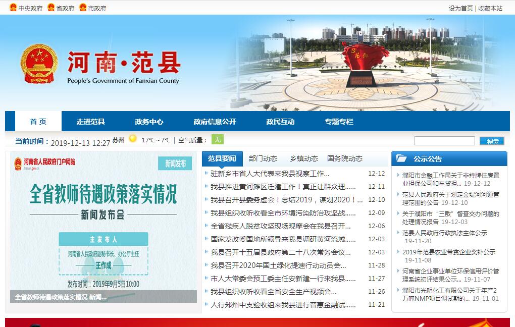 范县地处河南省东北部、豫鲁两省交界处,辖8镇4乡和1个范水办事处(筹),面积617平方公里,耕地54万亩,574个行政村,56万人。黄河、金堤河横贯县境,沿黄线长达47公里,是国家扶贫开发重点县。2019年上半年,一般公共预算收入完成4.36亿元,同比增长16.9%;预计全县生产总值完成102.1亿元,增长8.2%;规模以上工业增加值增长8.6%;社会消费品零售总额完成37.6亿元,增长9.9%;居民人均可支配收入完成7298元,增长8.8%;工业用电量完成4.75亿千瓦时,增长4.37%。千年古县,文化底蕴深厚。西汉初置县,因范水穿城而过得名,迄今已有2200余年历史,是范姓、顾姓、秦姓、姚姓的起源地。春秋军事家孙膑、晋国上卿范武子、一代廉吏叶廷秀、北宋纸币之父张咏等均诞生于此;古代晋楚“城濮之战”、齐魏“孙庞斗智”、“二十四孝”中的“四孝”等均发生在这里,现有丹朱遗址、闵子骞墓、苏佑墓、范武子墓等文化古迹。“扬州八怪”之一的郑板桥,曾在此任县令五载,其勤政为民、亲民爱民的逸闻趣事至今仍广为流传。投资拍摄的电视剧《“糊涂”县令郑板桥》在多家卫视播放。革命老区,传承红色基因。范县1927年就有了党的活动,1932年建立了党组织。抗日战争时期,这里是冀鲁豫边区党政军机关驻地,邓小平、刘伯承、段君毅等老一辈无产阶级革命家曾留下光辉足迹,被誉为华北“小延安”。战争年代,范县人民不畏艰难、不怕牺牲,参军参战,英勇杀敌,踊跃支前,为国家的独立和人民的解放做出了巨大贡献。颜村铺革命旧址被列为全国重点文物保护单位,白衣阁晋冀鲁豫野战军指挥部被列为省级文物保护单位。资源丰富,发展前景广阔。范县林业、水稻、小麦、玉米等农副产品丰富,系国家有机产品认证示范区,有“中原米乡”“莲藕之乡”之称,“范县大米”被评为国家地理标志保护产品,范县莲藕、范县黄金鳅近20个产品被评为有机产品。石油、天然气、卤水、煤炭储量丰富,是中原油田油、气主产区。晋豫鲁重载铁路穿境而过,濮范高速与德上高速在境内交汇,范莘公路开辟了除G240外范县连通山东的又一通道,承东启西、贯通南北的交通网络正在形成。积极探索新型工业化之路,强力推进产业转型升级,规划面积13平方公里的产业集聚区已形成濮王化工园区、新区产业园、濮阳木业园的“一区三园”发展格局,发展后劲十足、前景广阔。近年来,范县深入学习贯彻习近平新时代中国特色社会主义思想和党的十九大精神,认真落实习近平总书记调研指导河南时提出“四个着力”,打好“四张牌”、县域治理“三起来”、乡镇工作“三结合”等重要指示精神,牢牢把握党的建设高质量推动经济发展高质量,实现中原更加出彩的奋斗目标,按照“党建引领、脱贫攻坚、城乡融合、工业主导、农业固基、生态建设、民生改善”的工作思路,以供给侧结构性改革为主线,紧紧扭住乡村振兴战略这一总抓手,持续巩固扩大脱贫攻坚战果,加快形成结构优化、创新驱动、区域协调、城乡一体的发展格局,努力实现经济发展高质量。先后荣获“四好农村路”全国示范县、全省教育宣传先进县、全省慢性病综合防控示范区等多项荣誉。