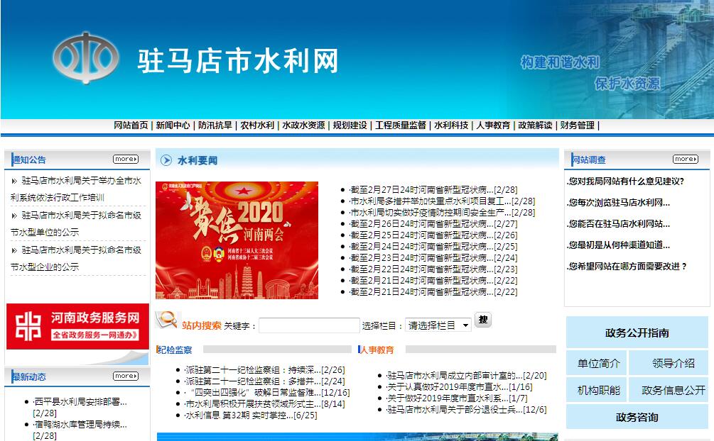 (二)负责保障水资源的合理开发利用。负责各项水利法律、法规和政策的贯彻落实并监督实施,指导和组织编制、审查、申报水利综合规划、专业规划、专项规划。(三)负责生活、生产经营和生态环境用水的统筹和保障。组织实施最严格水资源管理制度,拟订全市和跨县(区)水中长期供求规划、水量分配方案并监督实施。负责江河湖库和重要水工程的水资源调度。组织实施取水许可、水资源有偿使用制度和水资源论证、防洪论证制度。指导水利行业供水和乡镇供水工作。(四)按规定制定水利工程建设有关制度并组织实施,负责提出中央、省下达的和市级水利固定资产投资规模、方向、具体安排建议并组织实施,按市政府规定权限审批、核准规划内和年度计划规模内固定资产投资项目,提出中央、省和市级水利资金安排建议并负责项目实施的监督管理。按市政府规定权限,指导和组织编制、审查、申报水利基本建设项目建议书、可行性研究报告和初步设计,负责审批市级水利基本建设项目初步设计文件工作。(五)负责水资源保护工作。组织编制并实施水资源保护规划,组织开展河湖水生态保护与修复,指导河湖生态流量水量管理以及河湖水系连通工作。指导饮用水水源保护工作,开展重要江河湖库健康评估,指导地下水开发利用和地下水资源管理保护。组织指导地下水超采区综合治理。(六)负责节约用水工作。拟订全市节约用水制度,组织编制节约用水规划并监督实施,贯彻执行有关用水、节水标准。组织实施用水总量控制、用水效率控制、计划用水和定额管理等制度,组织、管理、监督节约用水工作,指导和推动节水型社会建设工作。(七)指导水文工作。协助做好全市水文行业监督管理和水文水资源监测,水文站网建设和管理,对江河湖库和地下水的水量、水质实施监测,发布水文水资源信息、情报预报和全市水资源公报。按规定组织开展水资源、水能资源调查评价和水资源承载能力监测预警工作。(八)负责全市水利设施、水域及其岸线的管理、保护与综合利用。组织指导水利基础设施网络建设,指导江河湖库及滩地的治理、开发和保护。指导水利工程建设与运行管理,负责水利工程质量监督检查工作,监督执行水利工程造价,组织实施具有控制性的或跨县(区)的重要水利工程建设、验收与运行管理工作,负责重要河流和重要水工程的调度工作,负责全市河道采砂的行业管理和监督检查工作。组织指导并监督检查全面推行河长制湖长制工作。(九)负责驻马店市南水北调工程运行与管理工作。贯彻落实国家和省、市南水北调工程运行管理和后续工程建设的法律、法规和政策;负责我市南水北调工程运行管理;拟定我市南水北调工程年度水量调度计划并组织实施;负责市级南水北调工程水费征缴、管理和使用。 (十)负责水土保持工作。拟订全市水土保持规划并监督实施,组织实施水土流失综合防治和全市水土流失监测、预报并公告。负责建设项目水土保持监督管理工作,指导水土保持重点建设项目的实施。(十一)负责农村水利工作。组织开展大中型灌排工程建设与改造。指导农村饮水安全工程建设与管理工作,指导节水灌溉有关工作。指导农村水利改革创新和社会化服务体系建设。负责农村水能资源开发,指导小水电改造和水电农村电气化工作。(十二)负责水利工程移民管理工作。贯彻落实水利水电工程征地移民政策,编制移民规划、计划。组织指导移民搬迁、安置验收、监督评估和后期扶持工作。管理和监督移民资金的使用。负责监督全市水利水电工程征地移民工作。(十三)负责较大涉水违法事件查处工作。指导全市水政监察和水行政执法,协调、仲裁并处理跨县(区)水事纠纷。负责水利行业安全生产工作,组织指导水库、水电站大坝、农村水电站的安全监督管理。指导水利建设市场的监督管理工作,组织开展水利工程建设监督和稽察工作。(十四)开展全市水利科技和对外合作工作。组织开展水利行业质量监督工作,指导监督水利行业技术标准、规程规范的实施,承担水利统计工作。指导水利系统对外合作交流。(十五)负责落实全市综合防灾减灾规划相关要求,组织编制洪水干旱灾害防治规划和防护标准并指导实施。承担水情旱情监测预报预警工作。组织编制重要河流和重要水工程的防御洪水、抗御旱灾调度和应急水量调度方案,按程序报批并组织实施。承担防御洪水应急抢险的技术支撑工作。(十六)完成市委、市政府交办的其他任务。