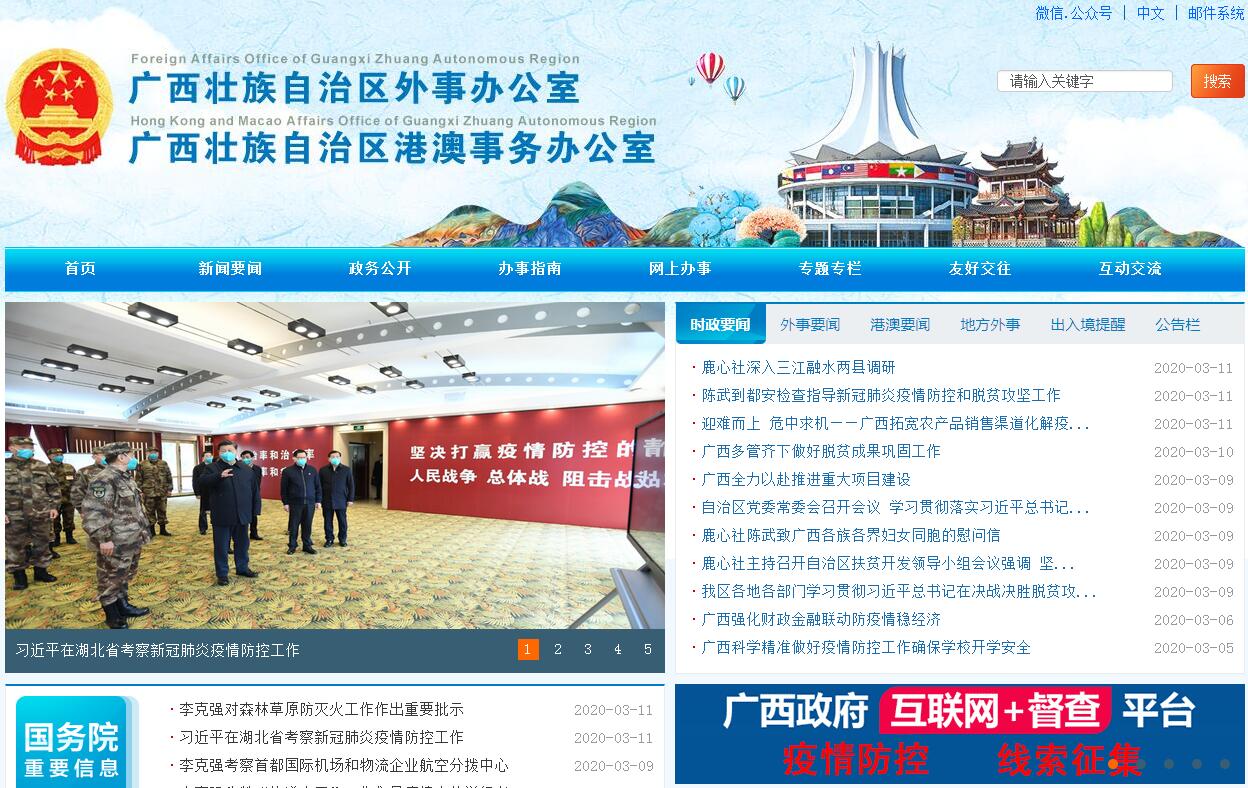 广西壮族自治区外事办公室主要职责:一、贯彻执行党和国家对外工作方针政策、法律法规和自治区党委、自治区人民政府外事工作决策部署。协调推进广西对外交流合作。研究制定广西外事工作发展规划和年度计划并组织实施。归口管理、指导和协调全区外事工作和重大涉外事务。负责区内外事工作联系指导、情况通报、业务考核、监督检查和干部培训等工作。二、围绕对外开放、参与国际性区域合作开展调查研究,为自治区党委、自治区人民政府外事工作决策提供意见建议。负责外事工作政策研究,起草外事地方性法规、规章草案和规范性文件,完善外事管理相关政策规定,并负责组织实施和监督检查。利用外部资源和对外工作渠道,推动广西参与国际性、地区性区域交流与合作。三、负责因公出访来访管理工作。根据中央有关部门授权,负责审核审批因公派遣团组出国、赴港澳特别行政区和邀请外国人来桂访问的有关事项。颁发因公出国护照、往来港澳通行证。办理申办外国签证(签注)、领事认证、外国人来华签证和居留登记手续。审核在我区举办国际会议的报批手续。四、负责涉外安全和领事保护工作。配合公安部门做好境外非政府组织和我区社会组织参加境外非政府组织活动的管理。处理或协助处理全区重大涉外和涉港澳案件、涉外突发事件。提供对外表态口径,会签全区重要涉外报道和涉外稿件。五、组织接待外国访桂的国宾、党宾、议会外宾和其他重要外宾。组织接待来桂访问的港澳特别行政区政府重要官员。统筹协调自治区领导的对外交往事宜。六、负责我区同我驻外使领馆和外国驻华外交、领事机构的工作联系。负责接待和管理来桂从事公务活动的外国外交人员。负责外国驻邕领事机构及其他官方、半官方机构有关事务的管理工作。归口管理外国记者、港澳记者来桂的采访活动。七、根据外交部授权,管理广西段中越陆地边界和北部湾海域边界。负责组织实施中越陆地边界广西段联合检查工作;会同有关部门处理边界涉外事务。协调我区同越南的交往,指导并参与边境会谈、会晤及联谊活动。八、归口管理、指导和协调全区同港澳特别行政区的交往事项。处理有关涉港澳事务。九、负责我区重要外事活动礼宾事宜。十、指导开展国外友好区(省、州、府)、友好城市和民间对外友好交往活动。十一、指导各市、区直单位和大专院校外事机构的业务工作。指导和协助各有关单位和学校对在桂外国专家、教师、留学生进行管理。十二、代管自治区人民对外友好协会。十三、完成自治区党委、自治区人民政府交办的其他任务。