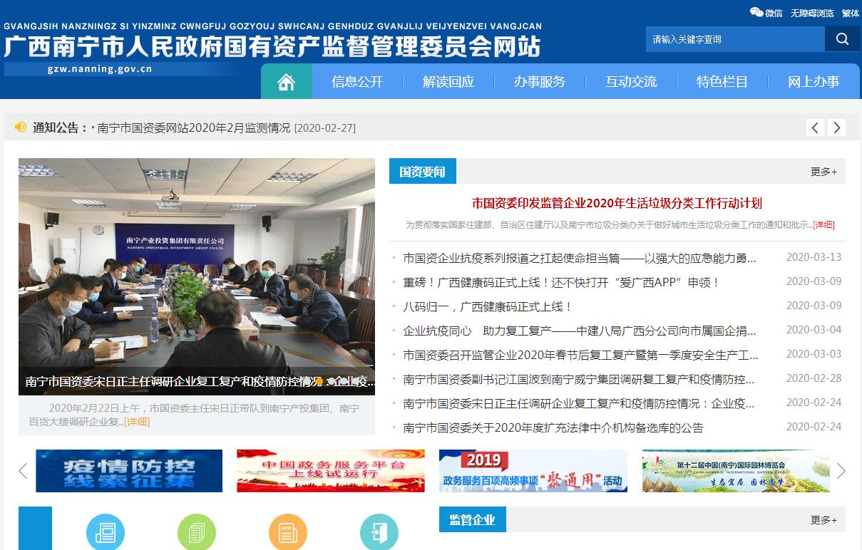 南宁市人民政府国有资产监督管理委员会,为市人民政府直属特设机构。其主要职责为:一、根据市人民政府授权,依照《中华人民共和国公司法》和《中华人民共和国企业国有资产法》等法律、法规和市人民政府规章履行出资人职责,监管市属企业的国有资产,加强国有资产的管理工作。二、负责企业国有资产基础管理,起草国有资产监督管理的地方性法规和市人民政府规章草案,制定有关监管制度;依法对县、区、开发区国有资产管理工作进行指导和监督。三、指导推进全市国有企业改革和重组,推进国有企业的现代企业制度建设,完善公司治理结构,推动国有经济布局和结构的战略性调整。四、承担监督所监管企业国有资产保值增值的责任。建立和完善国有资产保值增值指标体系,拟订考核标准,通过统计、稽核等方式对所监管企业国有资产的保值增值情况进行监管;负责所监管企业工资分配管理工作,制定所监管企业负责人收入分配办法并组织实施。五、通过法定程序对所监管企业负责人进行任免、考核并根据其经营业绩进行奖惩,建立符合社会主义市场经济体制和现代企业制度要求的选人、用人机制,完善经营管理者激励和约束制度。六、负责组织所监管企业上交国有资本收益,参与制定国有资本经营预算有关管理制度和办法,按照有关规定负责国有资本经营预决算编制和执行等工作。七、按照出资人职责,督促所监管企业贯彻落实国家安全生产方针政策及有关法律法规、标准等工作。八、根据市人民政府授权,负责对经营开发类事业单位国有资产的监督管理。九、承办市人民政府交办的其他事项。