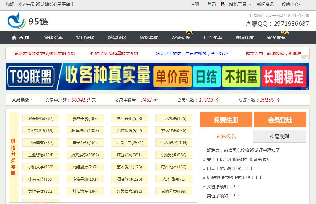 | 网站简介: 95链平台是国内新兴的站长交易平台。95链为站长提供友情链接买卖、网站广告买卖、软文发布交易、友情链接交换、外链代发等专业服务。95链一直在不断的努力,将持续不断地为广大站长提供优质、高效的服务。 |