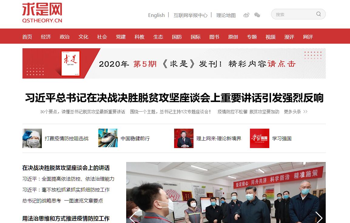 | 网站简介: 求是网(www.qstheory.cn)是中共中央机关刊《求是》杂志重要的网上理论传播平台,按照中央领导指示于2009年7月1日上线。网站充分发挥党刊资源优势,积极运用互联网新技术、新手段、新渠道,用思想的力量凝聚网上正能量,让党的主张成为信息时代最强音。求是网作为中宣部和中央网信办指定的“重点理论网站”,现已成为广大党员干部理论学习、经验交流和文献检索的优质网络平台,在党的思想理论传播和网上舆论引导中发挥着重要的旗舰作用。2017年3月,经中宣部批准,成立由求是杂志社全资投入并主管主办的求是网传媒(北京)有限公司。公司作为中央党刊贯彻落实媒体深度融合发展的理论传播平台和求是网的管理运营平台,致力于打造具有较强传播力引导力影响力公信力的新型党刊传媒企业。 |
