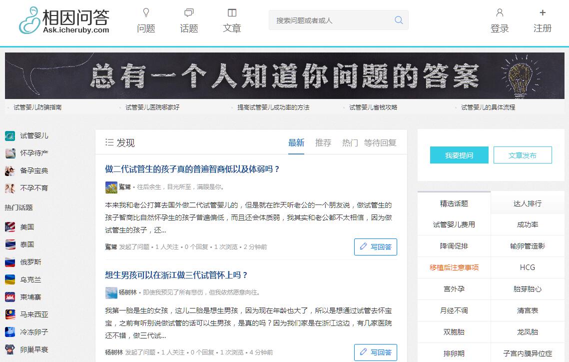 | 网站简介: 相因问答 - 试管婴儿互动问答平台,分享专业、实用、全面的试管婴儿成功经验和真实经历。在这里,你可以与其他准父母沟通交流美国、泰国、马来西亚、俄罗斯、柬埔寨、乌克兰等试管婴儿攻略,也可以获取就医流程、费用,查询医院、技术和成功率等试管婴儿知识。 |