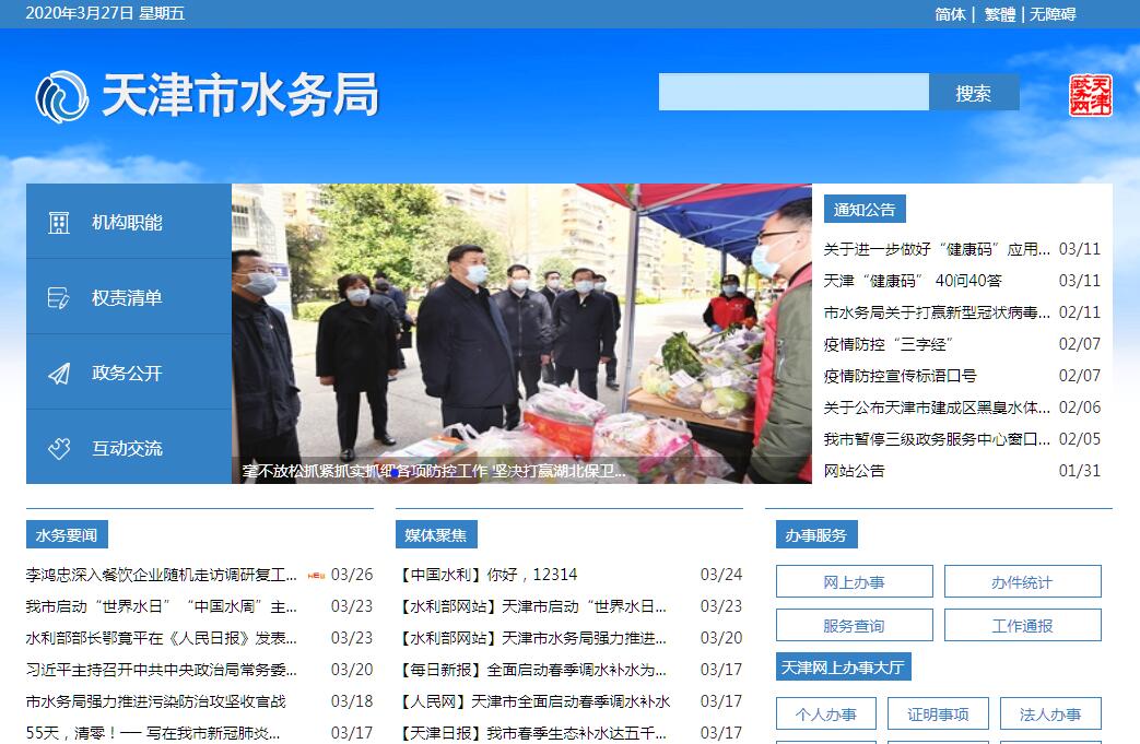 天津市水务局为负责全市水行政工作的市政府组成部门。其主要职责是:(一)贯彻执行国家有关水务工作的法律、法规、规章,研究起草地方性水行政管理法规和政府规章草案,拟订水务发展战略和政策措施,并组织实施。(二)组织编制水务发展规划及有关水务方面的专业规划,拟订水务发展年度计划,并监督实施。参与有关国民经济发展规划、城市规划及重大建设项目的论证工作。(三)负责保障水资源的合理开发利用。负责生活、生产经营和生态环境用水的统筹和保障。组织实施最严格水资源管理制度,实施水资源的统一监督管理,拟定本市水中长期供求规划、水量分配方案并监督实施。负责本市的水资源调度。组织实施取水许可、水资源论证制度,开展水资源有偿使用工作。负责淡化海水的资源配置工作。(四)按规定制定水利工程建设有关制度并组织实施。负责提出水务固定资产投资规模、方向、具体安排建议并组织指导实施,按规定权限审批、核准规划内和年度计划规模内固定资产投资项目,提出水务资金安排建议并负责项目实施的监督管理。(五)负责水资源保护工作。组织编制并实施水资源保护规划。负责饮用水水源保护有关工作,负责地下水开发利用和地下水资源管理保护。组织指导地下水超采区综合治理。(六)负责节约用水工作。拟订节约用水政策,组织编制节约用水规划并监督实施,组织制定有关标准。组织实施用水总量控制等管理制度,指导和推动节水型社会建设工作。(七)负责水文工作。负责水文水资源监测、市级水文站网建设和管理。对河湖库和地下水实施监测,发布水文水资源信息、情报预报和水资源公报。按规定组织开展水能资源调查评价和水资源承载能力监测预警工作。(八)负责水利设施、水域及其岸线的管理、保护与综合利用。组织水利基础设施网络建设。组织重要河湖及河口的治理、开发和保护。负责河湖水生态保护与修复、河湖生态流量水量管理以及河湖水系连通工作。负责水库移民管理工作。(九)负责水利工程建设和管理,组织、指导和监督水利工程设施的建设和运行管理。负责水利专业建设工程质量和安全监督管理。指导监督水利及城市供排水设施运行管理。组织实施具有控制性的和跨区域的重要水利工程的建设与运行管理。负责南水北调工程初步设计的审批和建设管理工作。(十)负责水土保持工作。拟订水土保持规划并监督实施,组织实施水土流失的综合防治、监测预报并定期公告。负责建设项目水土保持监督管理工作,指导重点水土保持建设项目的实施。(十一)指导农村水利工作。组织开展大中型灌排工程建设与改造。指导农村饮水安全工程建设与运行管理工作,指导节水灌溉有关工作。指导农村水利改革创新和社会化服务体系建设。指导农村水能资源开发、小水电改造和水电农村电气化工作。(十二)组织指导水政监察和水行政执法,负责水行政执法队伍建设,依法查处涉水违法行政案件。协调部门间和本市区域间的水事纠纷。依法负责水利及城市供排水行业安全生产监督管理工作,组织指导水库、大坝、农村水电站的安全监管。指导水利建设市场的监督管理,组织实施水利工程建设的监督。(十三)开展水务科技和对外技术合作交流工作。组织开展水利行业质量监督工作,拟定水利行业的技术标准、规程规范并监督实施。组织水务科学研究和技术推广。(十四)负责落实综合防灾减灾规划相关要求,组织编制洪水干旱灾害防治规划和防护标准并组织实施。组织实施防洪论证制度。承担水情旱情监测预警工作。组织编制重要河湖和重要水工程的防御洪水抗御旱灾调度及应急水量调度方案,按程序报批并组织实施。承担防御洪水应急抢险的技术支撑工作。承担台风防御期间重要水工程调度工作。(十五)负责城市供水、排水相关管理工作,并承担相应的监管责任。负责城市供水、排水、再生水和污水处理的行业管理工作。指导协调各区供水、排水管理工作。(十六)拟订水利、供水、排水行业的经济调节措施。负责供水、排水、污水处理的特许经营管理(不含中心城区新建),负责再生水处理与利用的特许经营管理。(十七)负责引滦、南水北调及其他外调水源相关管理工作,负责引滦工程和南水北调工程相关管理工作。负责跨界河流的对外协调工作。(十八)负责水务领域人才队伍建设。(十九)组织推动水务领域招商引资工作。(二十)完成市委、市政府交办的其他事项。