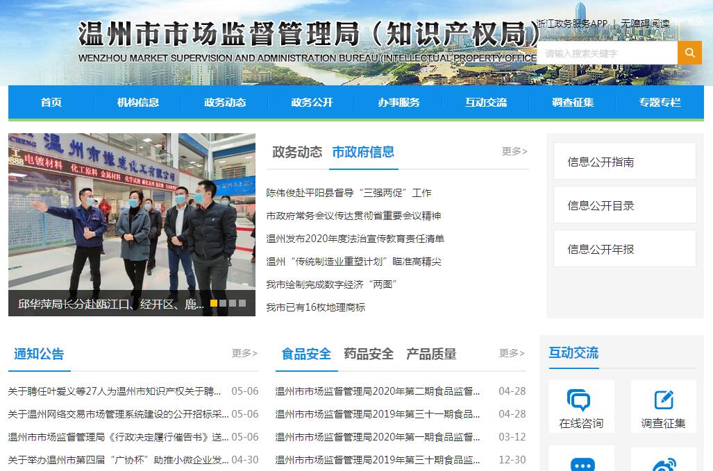 温州市市场监督管理局主要职责:(一)贯彻执行工商行政管理、食品药品(含食品添加剂、保健食品、化妆品、医疗器械,下同)监督管理等方面的法律、法规、规章和政策;拟订(或制定)并组织实施有关工商行政管理和食品药品监督管理方面的规范性文件。(二)拟订并组织实施市场监管事业发展规划和技术机构建设规划;组织实施商标战略;参与制定商品交易市场发展规划。(三)承担市食品安全委员会办公室的日常工作;负责食品安全监督管理综合协调,健全协调联动机制;督促市级有关部门和县(市、区)政府履行食品安全监督管理职责,并负责检查、考核评价工作。(四)负责食品安全应急体系和能力建设,组织拟订食品安全应急预案;牵头食品安全重大事故调查工作,组织、指导并监督食品安全突发事件调查处置工作;负责统一发布重大食品安全信息。(五)负责各类企业、合作社和从事经营活动的单位、个人以及外国(地区)企业常驻代表机构等市场主体的登记注册和食品药品等行政审批,并依法监管。(六)负责市场和网络交易行为及有关服务行为的监督管理,依法规范和维护市场经营秩序;依法监管经纪人、经纪机构及经纪活动;负责直销企业和直销人员及其直销活动的监督管理;负责拍卖行为的监督管理。(七)负责流通领域商品质量监管,开展有关服务领域消费维权工作,承担消费者权益保护责任,建立消费者权益保护体系。(八)组织实施合同行政监督管理和消费类格式合同条款备案,规范合同行为;负责动产抵押物登记管理。(九)负责商标的监督管理;依法保护商标专用权;推荐省著名商标,组织认定市知名商标;依法保护特殊标志、官方标志;负责地理标志产品日常监督管理工作。(十)指导广告业发展,负责广告活动的监督管理。(十一)负责组织开展企业信用体系建设,实施信用分类监管;组织开展企业、个体工商户、农民专业合作社、商品交易市场的年度报告和信用信息公示,并对公示信息实施监督管理。(十二)负责食品生产加工、流通和餐饮环节的监督管理;组织处置食品安全突发事件;负责对生产加工环节不安全食品的召回、餐饮环节实施餐饮食品安全标准和管理规范的情况进行监督;负责对食品质量进行监测。(十三)负责保健食品和化妆品生产、经营的监督管理;监督实施保健食品生产和经营质量管理规范、化妆品标准和技术规范;组织实施保健食品和化妆品安全性检测和评价、不良反应监测;负责保健食品、化妆品突发安全事故的应急处置。(十四)负责药品研制、生产的监督管理;监督实施国家药品标准、分类管理制度;监督实施药品研制和生产质量管理规范;配合有关部门实施国家基本药物制度;组织开展药品不良反应监测;负责突发性药品安全事故的应急处置和不安全药品召回的监督。(十五)负责药品流通的监督管理;实施药品经营质量管理规范;负责医疗机构使用药品的质量监管;组织实施处方药和非处方药分类管理制度。(十六)负责医疗器械研制、生产、经营、使用的监督管理;监督实施医疗器械标准和相关质量管理规范;组织开展医疗器械不良事件监测;负责突发性医疗器械安全事故的应急处置。(十七)负责食品药品的质量监督;指导全市食品药品检验检测机构的业务工作;组织实施执业药师资格准入制度,指导监督执业药师注册工作。(十八)负责涉及工商行政管理、食品药品监督管理的投诉和举报的处理;依法查处违反工商行政管理、食品药品监督管理法律、法规、规章的行为。(十九)承办市委、市政府和上级部门交办的其他事项。